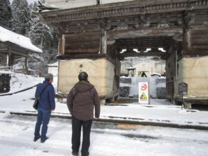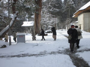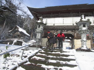 寺社巡り~寒河江慈恩寺参詣~16名の方が参加しました。生憎の降雪でありましたが、本山慈恩寺の見学を行いました。この寺院は、国内でも唯一無二の五尊像を有し、平安から鎌倉時代の仏像が間近に見られ、また、重厚な山門と、本堂は茅葺屋根であり冬囲いされた景観は穏やかな印象でした。