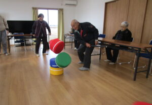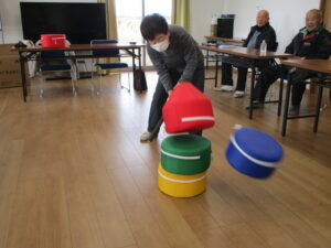 皆さん、だるま落としをするのは初めてのようで、最初はなかなか上手にだるまを残すことが出来ませんでしたが、練習を重ねると上手にだるまを残していました。終始笑顔で皆さんと楽しい時間を過ごしました。