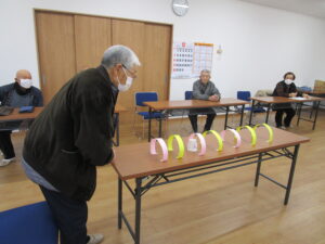 ふれ♡隊事業は砥落行政区の集会所で行っている、お茶っこ会に伺いました。今回はトンネル紙コップゲームと脳トレゲームを行ないました。