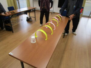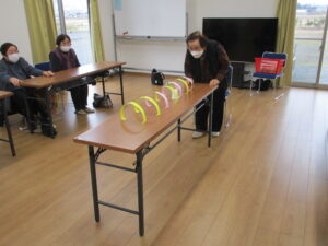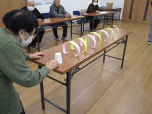 トンネル紙コップゲームは最後のトンネルをマイナス30点にし、力加減を調整しながらマイナス点にならないよう、皆さんに楽しんでもらいました。