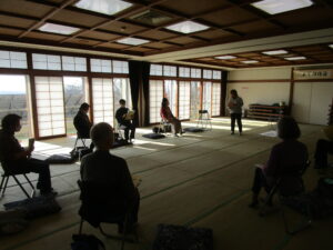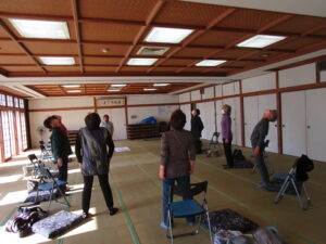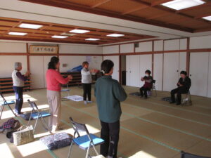 今回の婦人学級は、スポーツクラブみなみかたのクラブマネジャー、亀井あゆみさんを講師にお迎えしました。南方農村環境改善センターの日本間を会場にした「室内でできる簡単な体操」講座です。体操だけでなく、指や手のひらを揉むことで血行促進効果があり、体の動きも良くなることなども教えていただき、参加者さんは「こたつに座ったままでもできるね!」と楽しく学んでいました。