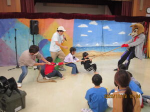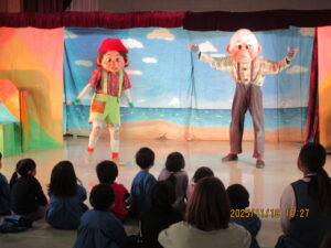 「劇団バンブー」さんをお呼びして、芸術鑑賞会(人形劇)を開催しました。南方幼稚園園児を含め地域の方も合わせ39名の方が参加されました。「ピノキオ」を観劇。はじめは静かに見ていた園児らも次第に前のめりになり、問い掛けに対して答えたり笑ったりして楽しい時間を過ごしました。
