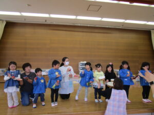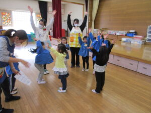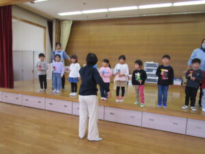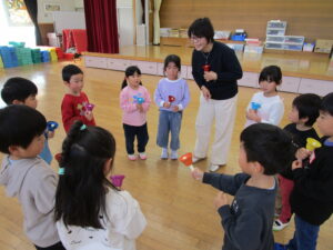 第4回のリズムで遊ぼうを開催しました。12月に幼稚園で予定されている「冬のつどい」に向けての練習をしました。年少児はタンバリン、ウッドブロック、鈴、カスタネットを使い合奏「おもちゃのチャチャチャ」の練習です。年長児はハンドベルを使い「虹の彼方へ」等の演奏練習を行ないました。とても上手にでき、「楽しかった。」と笑顔で話していました。