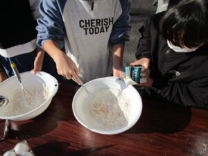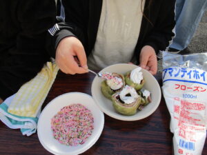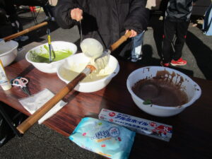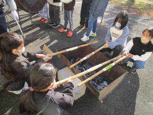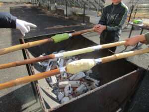 南方公民館の屋外でバーベキューコンロを使いバームクーヘン作りをしました。竹の棒にアルミホイルをまき、自分たちで作った生地をたらし、焼く作業を何回も繰り返し行ないました。竹の棒をくるくる回しながら、みんな一生懸命焼いていました。焼き上がったバームクーヘンをそれぞれ思い思いにデコレーションをし、美味しそうに食べていました。最後に竹串にマシュマロを刺し、焼きマシュマロにしてみんなで食べました。ニコニコの笑顔で食べていました。